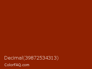 Decimal 39872534313 Color is a dark red color and the nearest color is Totem Pole #991b07. Hex code #902101 and RGB value is rgb(144,33,1). In RGB color space, this color is composed of 56% red, 13% green, 0% blue, In CMYK color space, this color is composed of 0% cyan, 77% magenta, 99% yellow , 44% black , In HSL color space, this color has a hue angle of 13° , 99% saturation and 28% lightness.