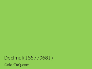 Decimal 155779681 Color is a normal green color and the nearest color is Dollar Bill #85bb65. Hex code #90cf55 and RGB value is rgb(144,207,85). In RGB color space, this color is composed of 56% red, 81% green, 33% blue, In CMYK color space, this color is composed of 30% cyan, 0% magenta, 59% yellow , 19% black , In HSL color space, this color has a hue angle of 91° , 56% saturation and 57% lightness.