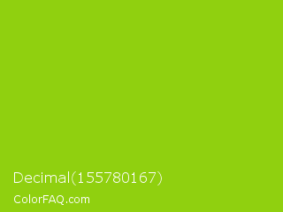 Decimal 155780167 Color is a normal green color and the nearest color is Sheen Green #8fd400. Hex code #90d00f and RGB value is rgb(144,208,15). In RGB color space, this color is composed of 56% red, 82% green, 6% blue, In CMYK color space, this color is composed of 31% cyan, 0% magenta, 93% yellow , 18% black , In HSL color space, this color has a hue angle of 80° , 87% saturation and 44% lightness.