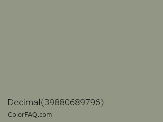 Decimal 39880689796 Color is a normal lime color and the nearest color is Artichoke #8f9779. Hex code #929684 and RGB value is rgb(146,150,132). In RGB color space, this color is composed of 57% red, 59% green, 52% blue, In CMYK color space, this color is composed of 3% cyan, 0% magenta, 12% yellow , 41% black , In HSL color space, this color has a hue angle of 73° , 8% saturation and 55% lightness.