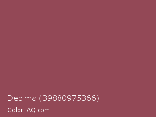 Decimal 39880975366 Color is a normal red color and the nearest color is Copper Rust #944747. Hex code #934856 and RGB value is rgb(147,72,86). In RGB color space, this color is composed of 58% red, 28% green, 34% blue, In CMYK color space, this color is composed of 0% cyan, 51% magenta, 41% yellow , 42% black , In HSL color space, this color has a hue angle of 349° , 34% saturation and 43% lightness.