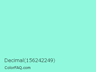 Decimal 156242249 Color is a light cyan color and the nearest color is Aquamarine #7fffd4. Hex code #90f9dd and RGB value is rgb(144,249,221). In RGB color space, this color is composed of 56% red, 98% green, 87% blue, In CMYK color space, this color is composed of 42% cyan, 0% magenta, 11% yellow , 2% black , In HSL color space, this color has a hue angle of 164° , 90% saturation and 77% lightness.