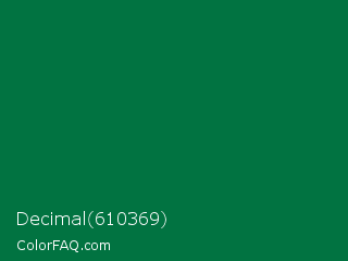 Decimal 610369 Color is a dark green color and the nearest color is Dartmouth Green #00703c. Hex code #017341 and RGB value is rgb(1,115,65). In RGB color space, this color is composed of 0% red, 45% green, 25% blue, In CMYK color space, this color is composed of 99% cyan, 0% magenta, 43% yellow , 55% black , In HSL color space, this color has a hue angle of 154° , 98% saturation and 23% lightness.