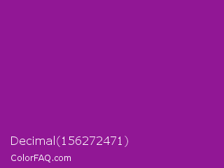 Decimal 156272471 Color is a normal magenta color and the nearest color is Violet Eggplant #991199. Hex code #911795 and RGB value is rgb(145,23,149). In RGB color space, this color is composed of 57% red, 9% green, 58% blue, In CMYK color space, this color is composed of 3% cyan, 85% magenta, 0% yellow , 42% black , In HSL color space, this color has a hue angle of 298° , 73% saturation and 34% lightness.