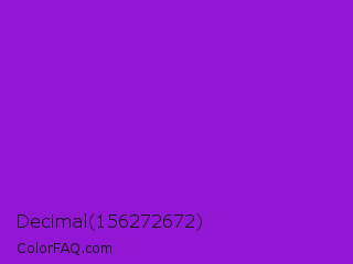 Decimal 156272672 Color is a normal purple color and the nearest color is French Violet #8806ce. Hex code #9117d4 and RGB value is rgb(145,23,212). In RGB color space, this color is composed of 57% red, 9% green, 83% blue, In CMYK color space, this color is composed of 32% cyan, 89% magenta, 0% yellow , 17% black , In HSL color space, this color has a hue angle of 279° , 80% saturation and 46% lightness.