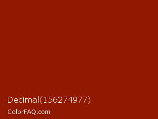 Decimal 156274977 Color is a dark red color and the nearest color is Totem Pole #991b07. Hex code #911901 and RGB value is rgb(145,25,1). In RGB color space, this color is composed of 57% red, 10% green, 0% blue, In CMYK color space, this color is composed of 0% cyan, 83% magenta, 99% yellow , 43% black , In HSL color space, this color has a hue angle of 10° , 99% saturation and 29% lightness.