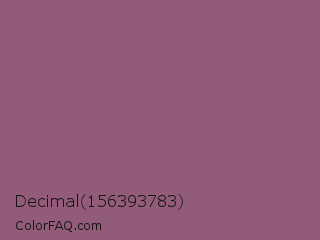 Decimal 156393783 Color is a normal magenta color and the nearest color is Antique Fuchsia #915c83. Hex code #915b79 and RGB value is rgb(145,91,121). In RGB color space, this color is composed of 57% red, 36% green, 47% blue, In CMYK color space, this color is composed of 0% cyan, 37% magenta, 17% yellow , 43% black , In HSL color space, this color has a hue angle of 327° , 23% saturation and 46% lightness.