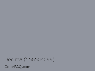 Decimal 156504099 Color is a normal blue color and the nearest color is Manatee Crayola #8d90a1. Hex code #91959f and RGB value is rgb(145,149,159). In RGB color space, this color is composed of 57% red, 58% green, 62% blue, In CMYK color space, this color is composed of 9% cyan, 6% magenta, 0% yellow , 38% black , In HSL color space, this color has a hue angle of 223° , 7% saturation and 60% lightness.