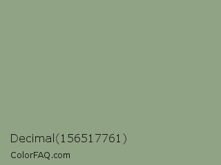 Decimal 156517761 Color is a normal green color and the nearest color is Envy #8ba690. Hex code #91a385 and RGB value is rgb(145,163,133). In RGB color space, this color is composed of 57% red, 64% green, 52% blue, In CMYK color space, this color is composed of 11% cyan, 0% magenta, 18% yellow , 36% black , In HSL color space, this color has a hue angle of 96° , 14% saturation and 58% lightness.