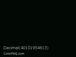 Decimal 40101954613 Color is a almost black green color and the nearest color is Rich Black FOGRA39 #010203. Hex code #020803 and RGB value is rgb(2,8,3). In RGB color space, this color is composed of 1% red, 3% green, 1% blue, In CMYK color space, this color is composed of 75% cyan, 0% magenta, 63% yellow , 97% black , In HSL color space, this color has a hue angle of 130° , 60% saturation and 2% lightness.