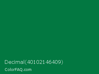 Decimal 40102146409 Color is a dark green color and the nearest color is Dartmouth Green #00703c. Hex code #027841 and RGB value is rgb(2,120,65). In RGB color space, this color is composed of 1% red, 47% green, 25% blue, In CMYK color space, this color is composed of 98% cyan, 0% magenta, 46% yellow , 53% black , In HSL color space, this color has a hue angle of 152° , 97% saturation and 24% lightness.