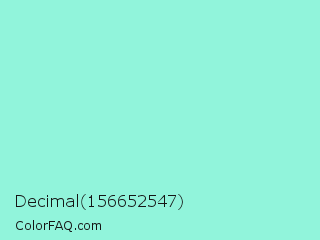 Decimal 156652547 Color is a light cyan color and the nearest color is Riptide #8be6d8. Hex code #91f4db and RGB value is rgb(145,244,219). In RGB color space, this color is composed of 57% red, 96% green, 86% blue, In CMYK color space, this color is composed of 41% cyan, 0% magenta, 10% yellow , 4% black , In HSL color space, this color has a hue angle of 165° , 82% saturation and 76% lightness.