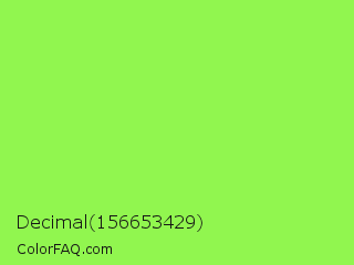 Decimal 156653429 Color is a light green color and the nearest color is Kiwi #8ee53f. Hex code #91f64f and RGB value is rgb(145,246,79). In RGB color space, this color is composed of 57% red, 96% green, 31% blue, In CMYK color space, this color is composed of 41% cyan, 0% magenta, 68% yellow , 4% black , In HSL color space, this color has a hue angle of 96° , 90% saturation and 64% lightness.