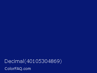 Decimal 40105304869 Color is a dark blue color and the nearest color is Dark Imperial Blue #00147e. Hex code #071875 and RGB value is rgb(7,24,117). In RGB color space, this color is composed of 3% red, 9% green, 46% blue, In CMYK color space, this color is composed of 94% cyan, 79% magenta, 0% yellow , 54% black , In HSL color space, this color has a hue angle of 231° , 89% saturation and 24% lightness.