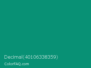 Decimal 40106338359 Color is a dark cyan color and the nearest color is Observatory #02866f. Hex code #089175 and RGB value is rgb(8,145,117). In RGB color space, this color is composed of 3% red, 57% green, 46% blue, In CMYK color space, this color is composed of 94% cyan, 0% magenta, 19% yellow , 43% black , In HSL color space, this color has a hue angle of 168° , 90% saturation and 30% lightness.