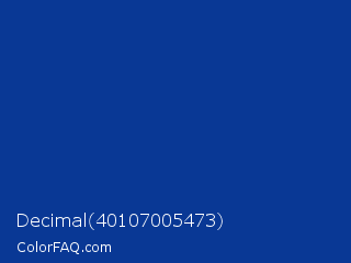 Decimal 40107005473 Color is a normal blue color and the nearest color is Smalt #003399. Hex code #093895 and RGB value is rgb(9,56,149). In RGB color space, this color is composed of 4% red, 22% green, 58% blue, In CMYK color space, this color is composed of 94% cyan, 62% magenta, 0% yellow , 42% black , In HSL color space, this color has a hue angle of 220° , 89% saturation and 31% lightness.