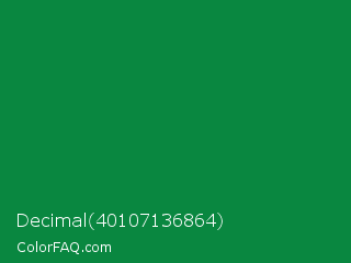 Decimal 40107136864 Color is a dark green color and the nearest color is Salem #097f4b. Hex code #098740 and RGB value is rgb(9,135,64). In RGB color space, this color is composed of 4% red, 53% green, 25% blue, In CMYK color space, this color is composed of 93% cyan, 0% magenta, 53% yellow , 47% black , In HSL color space, this color has a hue angle of 146° , 88% saturation and 28% lightness.