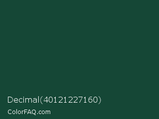 Decimal 40121227160 Color is a very dark green color and the nearest color is MSU Green #18453b. Hex code #154736 and RGB value is rgb(21,71,54). In RGB color space, this color is composed of 8% red, 28% green, 21% blue, In CMYK color space, this color is composed of 70% cyan, 0% magenta, 24% yellow , 72% black , In HSL color space, this color has a hue angle of 160° , 54% saturation and 18% lightness.