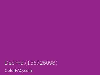 Decimal 156726098 Color is a normal magenta color and the nearest color is Razzmic Berry Crayola #843179. Hex code #922388 and RGB value is rgb(146,35,136). In RGB color space, this color is composed of 57% red, 14% green, 53% blue, In CMYK color space, this color is composed of 0% cyan, 76% magenta, 7% yellow , 43% black , In HSL color space, this color has a hue angle of 305° , 61% saturation and 35% lightness.