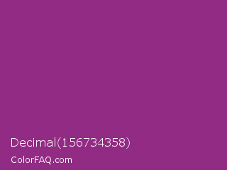 Decimal 156734358 Color is a normal magenta color and the nearest color is Razzmic Berry Crayola #843179. Hex code #922b84 and RGB value is rgb(146,43,132). In RGB color space, this color is composed of 57% red, 17% green, 52% blue, In CMYK color space, this color is composed of 0% cyan, 71% magenta, 10% yellow , 43% black , In HSL color space, this color has a hue angle of 308° , 54% saturation and 37% lightness.