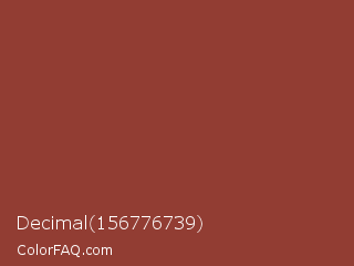 Decimal 156776739 Color is a normal red color and the nearest color is El Salva #8f3e33. Hex code #923d33 and RGB value is rgb(146,61,51). In RGB color space, this color is composed of 57% red, 24% green, 20% blue, In CMYK color space, this color is composed of 0% cyan, 58% magenta, 65% yellow , 43% black , In HSL color space, this color has a hue angle of 6° , 48% saturation and 39% lightness.