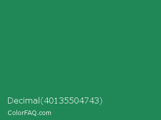 Decimal 40135504743 Color is a normal green color and the nearest color is Eucalyptus #278a5b. Hex code #208857 and RGB value is rgb(32,136,87). In RGB color space, this color is composed of 13% red, 53% green, 34% blue, In CMYK color space, this color is composed of 76% cyan, 0% magenta, 36% yellow , 47% black , In HSL color space, this color has a hue angle of 152° , 62% saturation and 33% lightness.