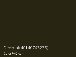 Decimal 40140743235 Color is a very dark yellow color and the nearest color is Mikado #2d2510. Hex code #282513 and RGB value is rgb(40,37,19). In RGB color space, this color is composed of 16% red, 15% green, 7% blue, In CMYK color space, this color is composed of 0% cyan, 8% magenta, 53% yellow , 84% black , In HSL color space, this color has a hue angle of 51° , 36% saturation and 12% lightness.