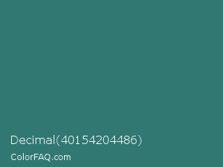 Decimal 40154204486 Color is a normal cyan color and the nearest color is Myrtle Green #317873. Hex code #327872 and RGB value is rgb(50,120,114). In RGB color space, this color is composed of 20% red, 47% green, 45% blue, In CMYK color space, this color is composed of 58% cyan, 0% magenta, 5% yellow , 53% black , In HSL color space, this color has a hue angle of 175° , 41% saturation and 33% lightness.