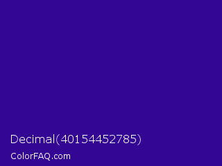 Decimal 40154452785 Color is a dark indigo color and the nearest color is Blue Gem #2c0e8c. Hex code #330693 and RGB value is rgb(51,6,147). In RGB color space, this color is composed of 20% red, 2% green, 58% blue, In CMYK color space, this color is composed of 65% cyan, 96% magenta, 0% yellow , 42% black , In HSL color space, this color has a hue angle of 259° , 92% saturation and 30% lightness.