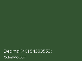 Decimal 40154583553 Color is a dark green color and the nearest color is Mughal Green #306030. Hex code #335431 and RGB value is rgb(51,84,49). In RGB color space, this color is composed of 20% red, 33% green, 19% blue, In CMYK color space, this color is composed of 39% cyan, 0% magenta, 42% yellow , 67% black , In HSL color space, this color has a hue angle of 117° , 26% saturation and 26% lightness.