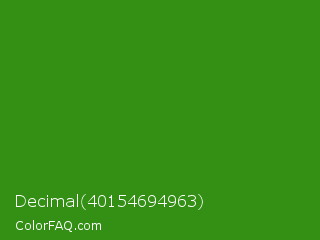 Decimal 40154694963 Color is a normal green color and the nearest color is La Palma #368716. Hex code #339015 and RGB value is rgb(51,144,21). In RGB color space, this color is composed of 20% red, 56% green, 8% blue, In CMYK color space, this color is composed of 65% cyan, 0% magenta, 85% yellow , 44% black , In HSL color space, this color has a hue angle of 105° , 75% saturation and 32% lightness.