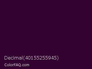 Decimal 40155255945 Color is a very dark magenta color and the nearest color is Mardi Gras #350036. Hex code #340131 and RGB value is rgb(52,1,49). In RGB color space, this color is composed of 20% red, 0% green, 19% blue, In CMYK color space, this color is composed of 0% cyan, 98% magenta, 6% yellow , 80% black , In HSL color space, this color has a hue angle of 304° , 96% saturation and 10% lightness.