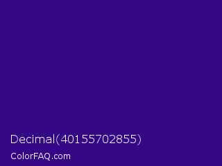 Decimal 40155702855 Color is a dark violet color and the nearest color is Kingfisher Daisy #3e0480. Hex code #350787 and RGB value is rgb(53,7,135). In RGB color space, this color is composed of 21% red, 3% green, 53% blue, In CMYK color space, this color is composed of 61% cyan, 95% magenta, 0% yellow , 47% black , In HSL color space, this color has a hue angle of 262° , 90% saturation and 28% lightness.