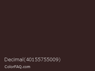 Decimal 40155755009 Color is a very dark red color and the nearest color is Cocoa Brown #301f1e. Hex code #352121 and RGB value is rgb(53,33,33). In RGB color space, this color is composed of 21% red, 13% green, 13% blue, In CMYK color space, this color is composed of 0% cyan, 38% magenta, 38% yellow , 79% black , In HSL color space, this color has a hue angle of 0° , 23% saturation and 17% lightness.