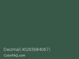 Decimal 40265684067 Color is a dark green color and the nearest color is Gray Asparagus #465945. Hex code #395847 and RGB value is rgb(57,88,71). In RGB color space, this color is composed of 22% red, 35% green, 28% blue, In CMYK color space, this color is composed of 35% cyan, 0% magenta, 19% yellow , 65% black , In HSL color space, this color has a hue angle of 147° , 21% saturation and 28% lightness.