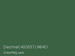 Decimal 40265719840 Color is a dark green color and the nearest color is Killarney #3a6a47. Hex code #396244 and RGB value is rgb(57,98,68). In RGB color space, this color is composed of 22% red, 38% green, 27% blue, In CMYK color space, this color is composed of 42% cyan, 0% magenta, 31% yellow , 62% black , In HSL color space, this color has a hue angle of 136° , 26% saturation and 30% lightness.