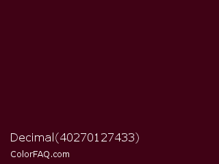 Decimal 40270127433 Color is a very dark rose color and the nearest color is Aubergine #3b0910. Hex code #400215 and RGB value is rgb(64,2,21). In RGB color space, this color is composed of 25% red, 1% green, 8% blue, In CMYK color space, this color is composed of 0% cyan, 97% magenta, 67% yellow , 75% black , In HSL color space, this color has a hue angle of 342° , 94% saturation and 13% lightness.