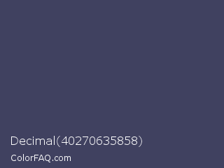 Decimal 40270635858 Color is a normal blue color and the nearest color is Gun Powder #414257. Hex code #404160 and RGB value is rgb(64,65,96). In RGB color space, this color is composed of 25% red, 25% green, 38% blue, In CMYK color space, this color is composed of 33% cyan, 32% magenta, 0% yellow , 62% black , In HSL color space, this color has a hue angle of 238° , 20% saturation and 31% lightness.
