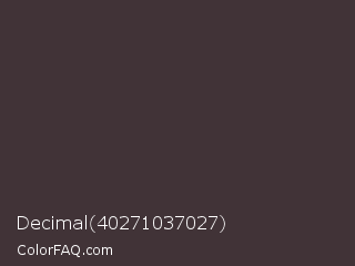 Decimal 40271037027 Color is a dark rose color and the nearest color is Masala #403b38. Hex code #413337 and RGB value is rgb(65,51,55). In RGB color space, this color is composed of 25% red, 20% green, 22% blue, In CMYK color space, this color is composed of 0% cyan, 22% magenta, 15% yellow , 75% black , In HSL color space, this color has a hue angle of 343° , 12% saturation and 23% lightness.