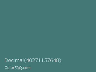 Decimal 40271157648 Color is a normal cyan color and the nearest color is Faded Jade #427977. Hex code #417876 and RGB value is rgb(65,120,118). In RGB color space, this color is composed of 25% red, 47% green, 46% blue, In CMYK color space, this color is composed of 46% cyan, 0% magenta, 2% yellow , 53% black , In HSL color space, this color has a hue angle of 178° , 30% saturation and 36% lightness.