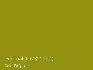 Decimal 157311329 Color is a normal yellow color and the nearest color is Dark Yellow #9b870c. Hex code #929411 and RGB value is rgb(146,148,17). In RGB color space, this color is composed of 57% red, 58% green, 7% blue, In CMYK color space, this color is composed of 1% cyan, 0% magenta, 89% yellow , 42% black , In HSL color space, this color has a hue angle of 61° , 79% saturation and 32% lightness.