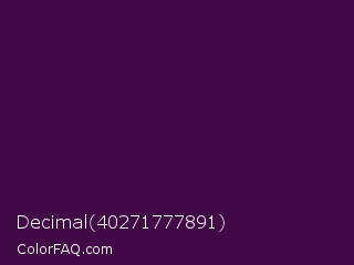 Decimal 40271777891 Color is a very dark magenta color and the nearest color is Loulou #460b41. Hex code #420947 and RGB value is rgb(66,9,71). In RGB color space, this color is composed of 26% red, 4% green, 28% blue, In CMYK color space, this color is composed of 7% cyan, 87% magenta, 0% yellow , 72% black , In HSL color space, this color has a hue angle of 295° , 78% saturation and 16% lightness.