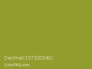 Decimal 157320340 Color is a normal yellow color and the nearest color is Sycamore #908d39. Hex code #929d2e and RGB value is rgb(146,157,46). In RGB color space, this color is composed of 57% red, 62% green, 18% blue, In CMYK color space, this color is composed of 7% cyan, 0% magenta, 71% yellow , 38% black , In HSL color space, this color has a hue angle of 66° , 55% saturation and 40% lightness.