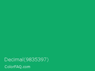 Decimal 9835397 Color is a normal green color and the nearest color is GO Green #00ab66. Hex code #0eab69 and RGB value is rgb(14,171,105). In RGB color space, this color is composed of 5% red, 67% green, 41% blue, In CMYK color space, this color is composed of 92% cyan, 0% magenta, 39% yellow , 33% black , In HSL color space, this color has a hue angle of 155° , 85% saturation and 36% lightness.