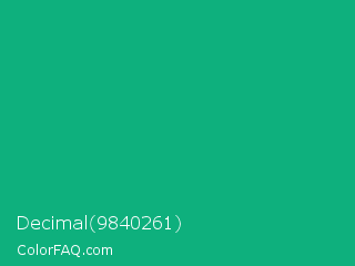 Decimal 9840261 Color is a normal green color and the nearest color is Mountain Meadow Crayola #1ab385. Hex code #0eb07d and RGB value is rgb(14,176,125). In RGB color space, this color is composed of 5% red, 69% green, 49% blue, In CMYK color space, this color is composed of 92% cyan, 0% magenta, 29% yellow , 31% black , In HSL color space, this color has a hue angle of 161° , 85% saturation and 37% lightness.