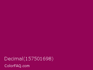 Decimal 157501698 Color is a dark magenta color and the nearest color is Cardinal Pink #8c055e. Hex code #930456 and RGB value is rgb(147,4,86). In RGB color space, this color is composed of 58% red, 2% green, 34% blue, In CMYK color space, this color is composed of 0% cyan, 97% magenta, 41% yellow , 42% black , In HSL color space, this color has a hue angle of 326° , 95% saturation and 30% lightness.
