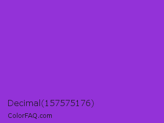 Decimal 157575176 Color is a normal purple color and the nearest color is Dark Orchid #9932cc. Hex code #9332d8 and RGB value is rgb(147,50,216). In RGB color space, this color is composed of 58% red, 20% green, 85% blue, In CMYK color space, this color is composed of 32% cyan, 77% magenta, 0% yellow , 15% black , In HSL color space, this color has a hue angle of 275° , 68% saturation and 52% lightness.