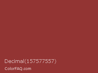 Decimal 157577557 Color is a normal red color and the nearest color is Stiletto #9c3336. Hex code #933433 and RGB value is rgb(147,52,51). In RGB color space, this color is composed of 58% red, 20% green, 20% blue, In CMYK color space, this color is composed of 0% cyan, 65% magenta, 65% yellow , 42% black , In HSL color space, this color has a hue angle of 1° , 48% saturation and 39% lightness.