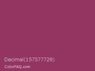 Decimal 157577729 Color is a normal rose color and the nearest color is Vin Rouge #983d61. Hex code #933461 and RGB value is rgb(147,52,97). In RGB color space, this color is composed of 58% red, 20% green, 38% blue, In CMYK color space, this color is composed of 0% cyan, 65% magenta, 34% yellow , 42% black , In HSL color space, this color has a hue angle of 332° , 48% saturation and 39% lightness.