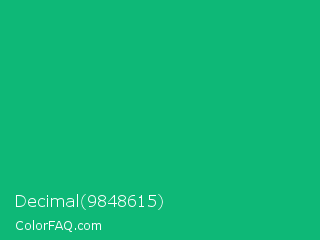 Decimal 9848615 Color is a normal green color and the nearest color is Green Crayola #1cac78. Hex code #0eb877 and RGB value is rgb(14,184,119). In RGB color space, this color is composed of 5% red, 72% green, 47% blue, In CMYK color space, this color is composed of 92% cyan, 0% magenta, 35% yellow , 28% black , In HSL color space, this color has a hue angle of 157° , 86% saturation and 39% lightness.